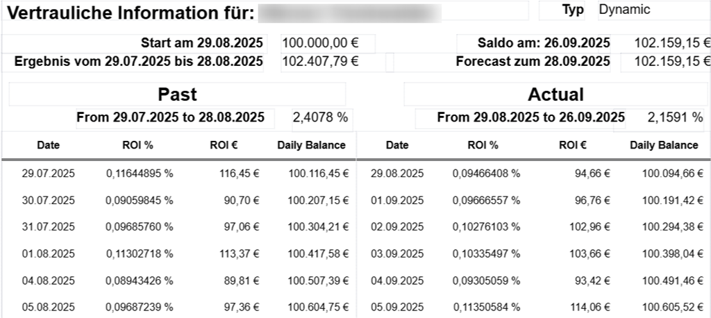 Kunden erhalten täglich die Gutschrift ihres anteiligen ROI. Der hieraus entstehende ROI-ReInvest-Effekt verbessert das Gesamtergebnis einer Einlage zusätzlich.